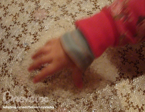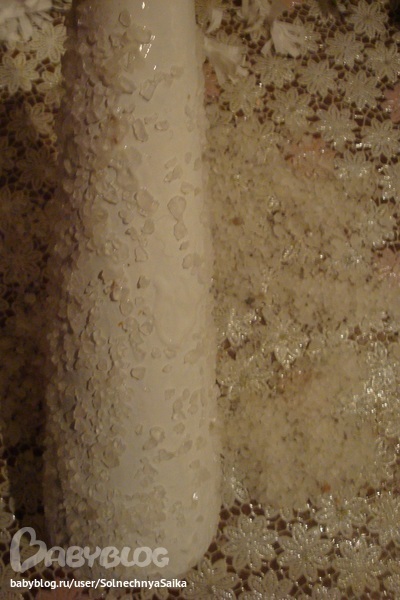 Далее мы перешли к изготовлению бутылки. Вот тут Соня точно лидировла. Лихо намазала её клеем (см. фото вверху) и щедро посыпала её морской солью, я только успевала бутылку поворачивать.