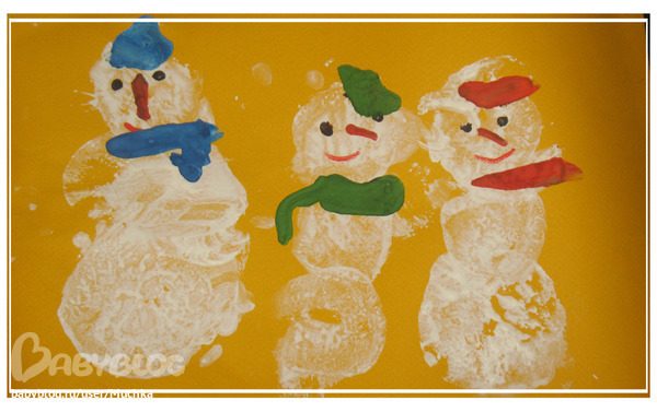 1. Рисуем штампиками из картошки. Картофелины разной величины разрезаем пополам и приступаем к рисованию. Можно нарисовать многое, но у Леры лучше всего получились снеговики. Семья - снеговик-папа в синей шапке, снеговик-мама в красной, и их доченька в зеленой))) Идея и воплощение принадлежат Лере, я напоминаю, что глаза должны быть вверху, а рот под глазами, а то у нас часто и наоборот бывает)))