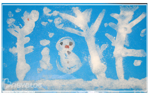 5. Рисуем солью. Сначала рисуем картинку клеем ПВА, потом засыпаем рисунки солью ждем пока все подсохнет, лишнюю соль стряхиваем с листа и получаются зимние пейзажи
