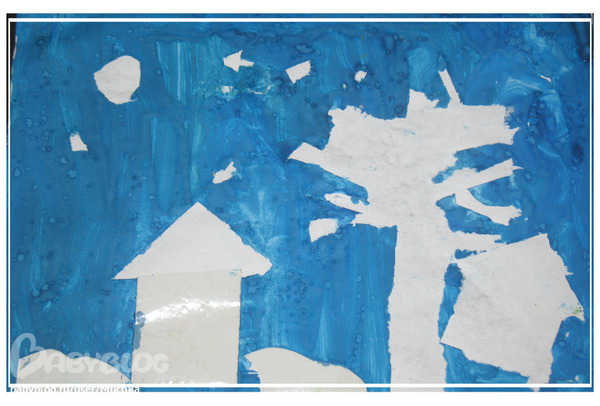 2. Рисуем с помощью скотча. Я наклеиваю несложные фигурки - домики, деревья. Лера закрашивает краской весь лист, полностью. Потом мы вместе снимаем скотч и получается "Зимний вечер". Домик под деревом кстати Лера клеила, поэтому он немного подпрыгивает)))