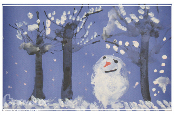 Лера дорисовывает снег на ветках кисточкой и рисует снеговика. Снеговиков она очень любит, поэтому они часто появляются на рисунках.