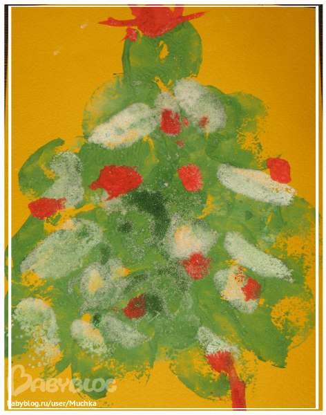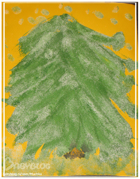 4. Рисуем зубной щеткой - очень симпотичные елочки получаются, и главное быстро. Сверху снег из соли сделали)