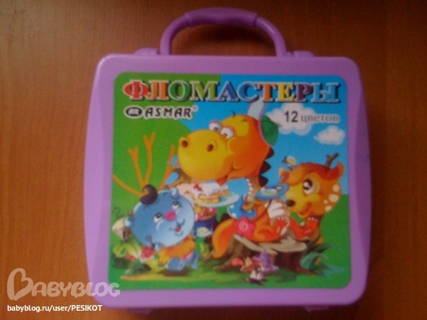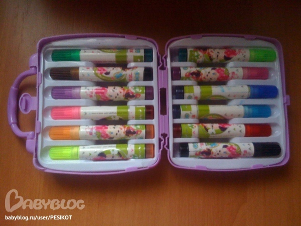 С одной стороны фломастера стержень, а с другого печать. Ева сама снимает колпачки, рисует черти что и складывает фломастеры обратно. Печати пока не заинтересовали. Складывание и раскладывание чемодана увлекает в 100 раз больше чем само рисование.