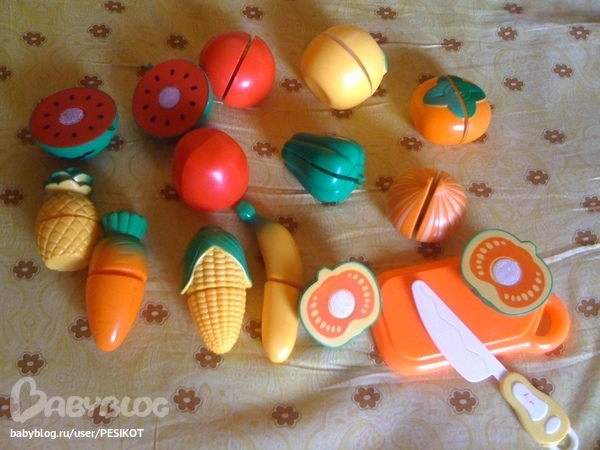 8. Овощи на липучке. Отличная вещь. Учит ребенка держать нож в руке. Можно учить конечно же все названия и части фруктов-овощей. Еще мы режем фрукты-овощи и кидаем их в кастрюлю, мешаем поварешкой и варим суп )