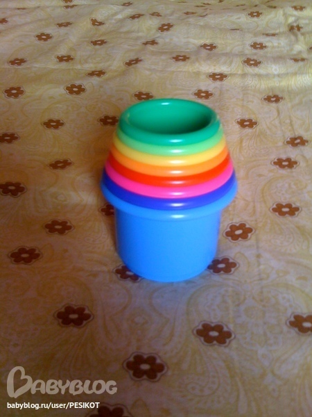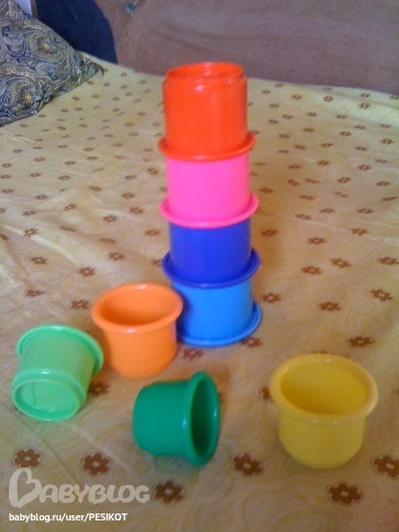 А можно друг на друга и строить пирамиду. Еще можно учить цвета. На доннышках стаканчиков нарисованы геометрические фигуры. Пирамиду Ева собирает за 20 секунд (ну если стаканчики в рядок выложить по порядку), а если не выкладывать, то минуту повозится.