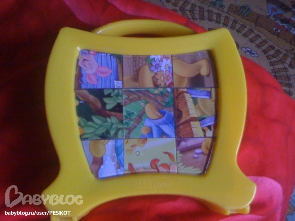 12. Кубики опять же в чемоданчике. Ева просто обожает всякие сумочки и чемоданчики. Носит на плече и мою сумку и термос на ремне. Красочные кубики по мотивам Диснеевского Витнни Пуха. На каждой картинке разное время года. Пока у Евы не получается собирать картинку, она просто достает и складывает кубики обратно или строит из них паровозик, а еще башню из всех 9ти кубиков.