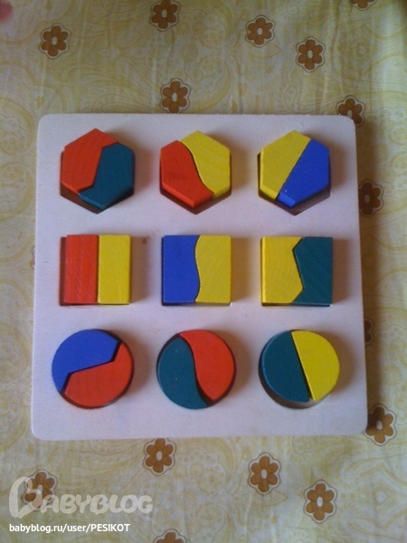 3. Деревянный сортер. Уже посложнее. Разбираю Еве по одному ряду и даю собирать. Или все три фигуры одной формы, или все разные фигуры, но с одинаковым по форме разрезом. Если перемешать все сразу, то она теряется и психует.
