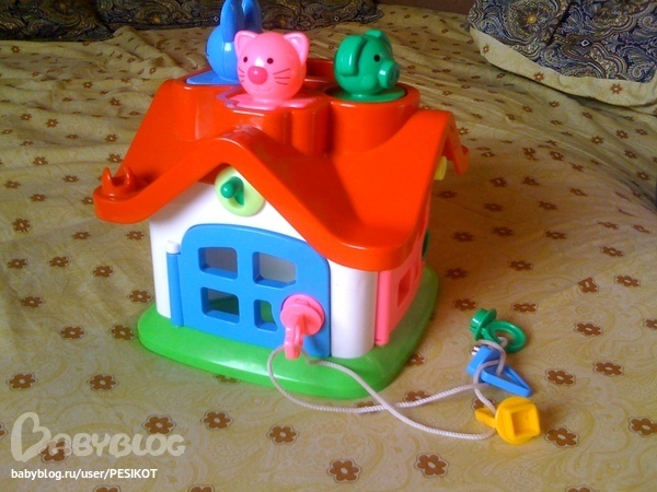 4. Чудо-домик. Тоже сортер. 4 комнатки закрываются 4мя ключиками. Сверху в домики идут "дымоходы" разных геометрических форм, соответственно к ним фигурки зверей с основаниями таких же форм. То есть у каждого зверька свой дом и свой ключик. Под козырьками крыш кнопочки и рычаги, чтобы игрушки проваливались в комнатки. Супер-вещь! Можно учить и названия зверей, и цвета, и формы. Ключики все разные, хорошо развивают моторику пальцев.