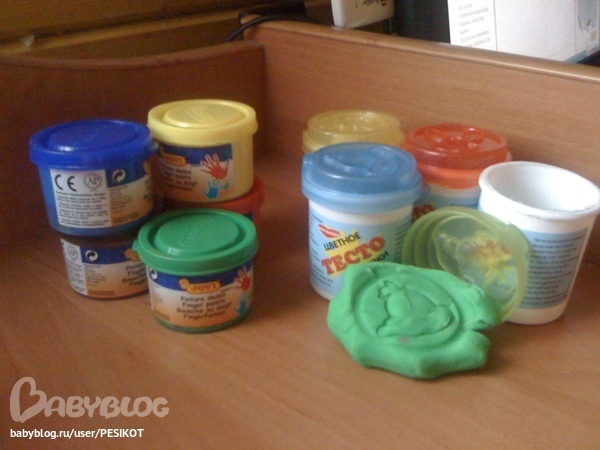 13. Пальчиковые краски и соленое тесто. Пальчиками рисовать как-то не понравилось Еве, а вот кисточкой пошло-поехало. Макает в водичку, в краску и рисует прекрасные красно-бурые лужи ) Из теста катает колбаски, мнет, щипает, одним словом развивает моторику рук. Тесто гораздо мягче и приятнее пластилина.
