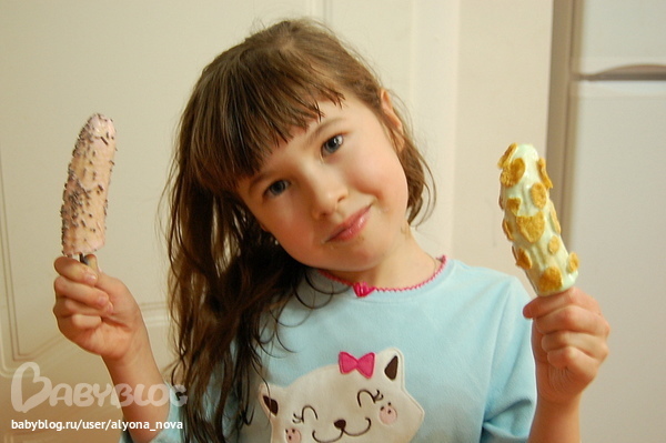 На вид лакомства, конечно, так себе получились, но на вкус «как мороженное, даже лучше» (слова Арины). Вместо глазури можно использовать крем-сыр, топленный шоколад (рецепт шоколадной глазури лучше уточнить, чтобы не растекалась). А обсыпать можно кокосовой стружкой, орешками, украшением для тортов, крошкой от печеньев.
