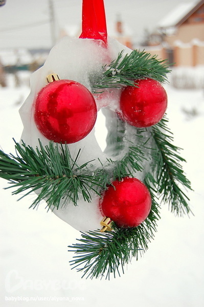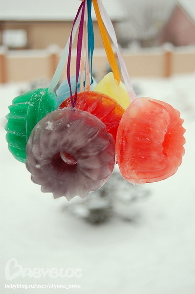 Идея не новая. Мне очень нравится, когда подобным образом замораживают ягоды (рябину, шиповник), веточки ели, можжевельника.