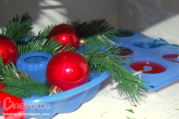 Сделали ледяной рождественский венок и ледяные медальоны. Набрали воды в форму для запекания, уложили веточки искусственной ели, елочные шары, в маленькие формочки добавили краситель – отправили на ночь в морозилку: