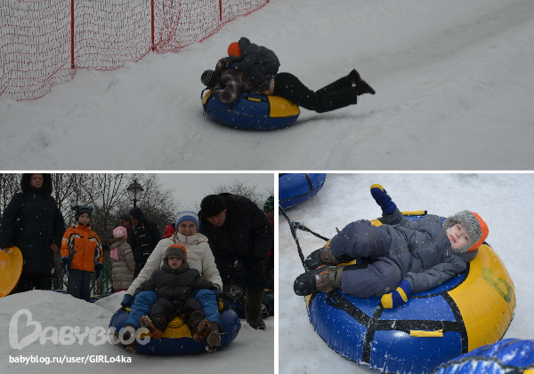 Прошло наверно минут 30-40, подошла наша очередь, взяли один тюбинг на час за 180 руб (30мин - 100руб). Сначала Андрей отказывался напрочь кататься, но все же уговорила вместе со мной спуститься. Под конец согласился оседлать папу. И уж на последних минутах скатился сам. Понравилось... но время истекало... Сказала, что если успеет подняться, то может еще раз скатится. Успел. Но хотел не один раз, а много.... но продлить чтобы время, нужно было опять отстоять очередь...так что пошли домой согревшись чаем))