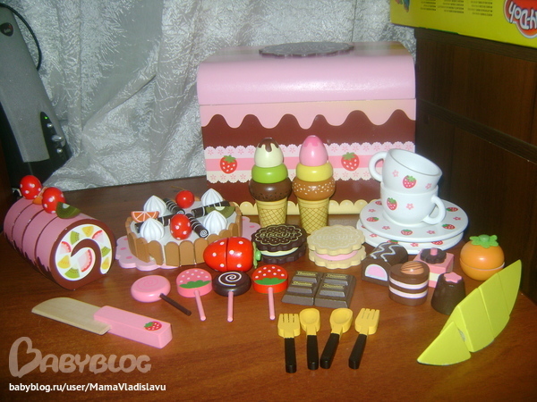 Коротко для тех,кто еще не в курсе :в комплект входит ножик,можно разрезать сладости на липучках:дыню,апельсин,клубнику,рулет(ягодки сверху вынимаются)тортик,печенье