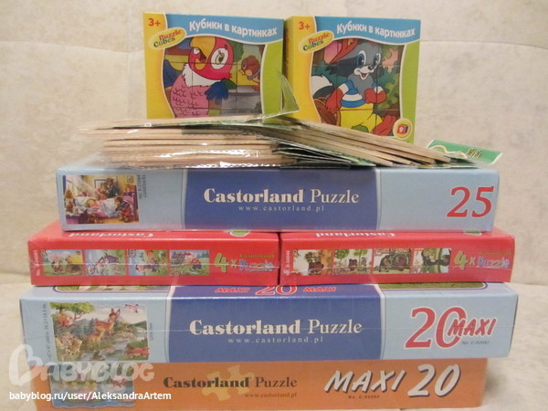Развивающие игрушки (пазлы, вкладыши, конструкторы, мозаики)Накупили ребенку на время болезни перед Новым годом паззлы, чтоб было чем заниматься. Долго выбирала, т.к. их такое множество, у всех разные материалы... В итоге, остановила выбор на паазлах фирмы Castorland. Честно говоря, я плохо предтавляла себе, из скольких деталей моя Полинка должна уже собирать картинки, но, т.к. дома были максимум 6, а в Castorland с большими деталями только от 20, то решила, что с ними как-нибудь справимся.
