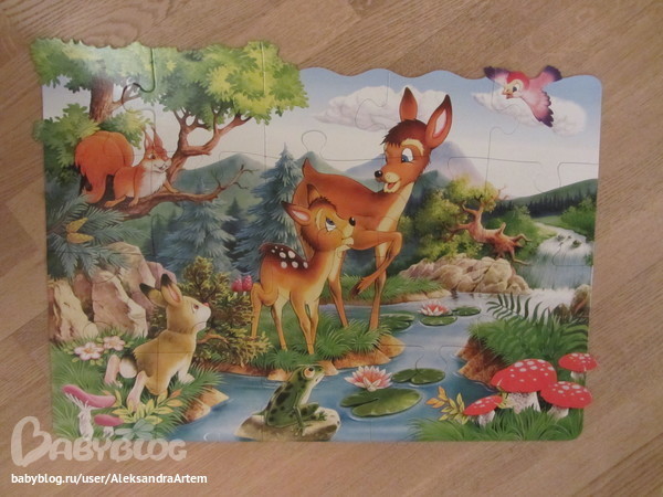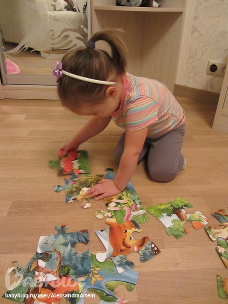 Что касается паззлов: очень качественный плотный картон, большие детали, красочные картинки. Ничего не расслаивается, ребенку очень нравится собирать. Покупкой более, чем довольна. Один раз собрали вместе, потом начала собирать сама, да довольно быстро. Теперь думаю покупать с большим количеством деталей, а то эти кажутся уже легкими.