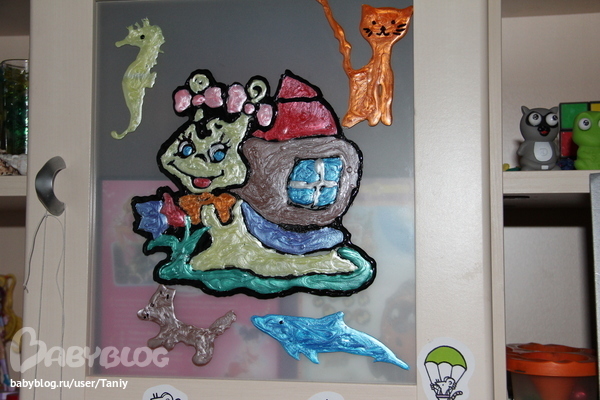 Мистер Умелец или Очумелые ручки (поделки, аппликации, интересные находки, идеи и задумки)Настя сейчас увлеклась вот таким творчеством. Сама рисует картинку, вставляет ее в файл и обводит и закрашивает витражными красками. Когда высохнет, можно наклеить на гладкую поверхность.
