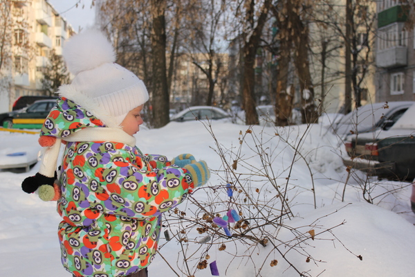 Все шло хорошо, но, подвешивая последний ледок, Катька поскользнулась и ветка ей в глаз попала :( Ничего страшного, но пришлось быстро бежать домой.