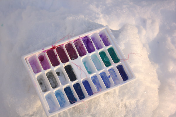 Делается очень просто: в форму для льда налить воду, покрасить водичку акварелью, в каждую ячейку положить ниточку и поставить в морозилку.