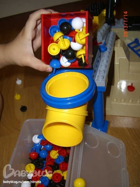 Игры и игрушки для детей от 2х-до 3-х летСобрались поиграть с Мишей в мозаику. Он вообще ее любит, но пока делает то, что ему нравится на мои предложения не реагирует. А тут до этого собрал он из лего трубу, ну я ее и приспособила, очень ему это понравилось. Насыпал, перевоачивал контейнер и ссыпал все фишки в коробку. Потом сам предположил, что если подвинуть коробку, то фишки полетят мимо, съедут по крышке и рассыпятся по полу. Сказал мне об этом и через пару минут попробовал. Предположение подтвердилось и увлекло)). Чтобы хоть как-то размять еще его пальчики, я быстро вставила все фишки в панель для мозаики, и прежде чем положить их в контейнер ему приходилось их вынимать из панели