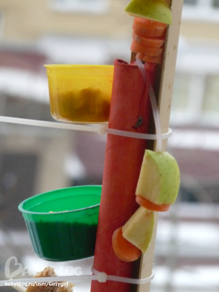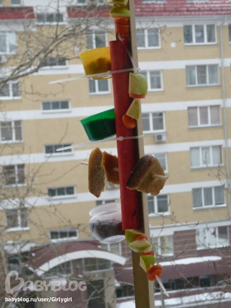 сначала планы были грандиозные: соорудить настоящую большую кормушку- домик)) но к счастью я вовремя осознала, что ни досок, ни пилы в доме не водится\. и колотить я ничего не собираюсь) поэтому родилась вот такая версия-лайт)... или "канапе party"... или "шведский стол")))