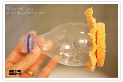 Отрежьте горлышко у пластиковой бутылки, на широкую часть натяните кусочек махровой ткани (полотенца или махрового носочка), замотайте резинкой, чтобы не слетело.