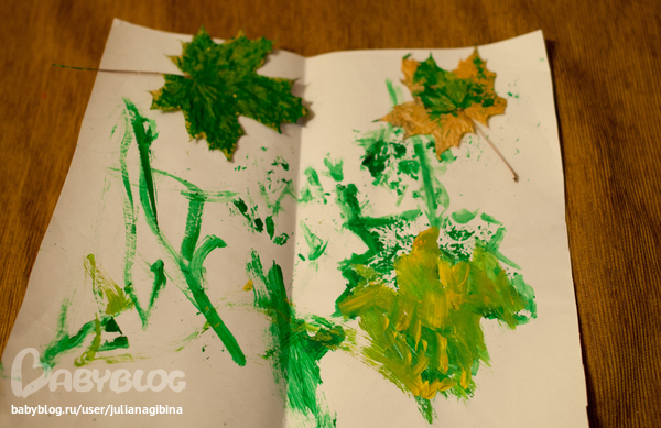 9. Делали волшебство. Нам хотелось оживить осенние листики и снова очутиться в лете. Поэтому листики по мгновению волшебной кисточки стали зелеными :))))