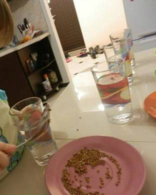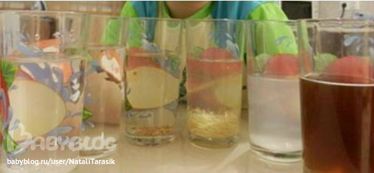 итак, перед вами шесть тарелок с крупами и шесть стаканов с теплой водой