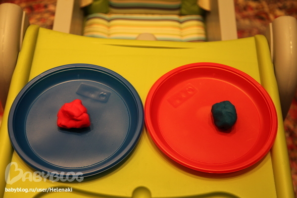Ход занятия: Показываем малышу тесто, заранее разложенное на одноразовые тарелочки. Для первого занятия я взяла красное и синее тесто и выложила их на красную и синюю тарелочку, чтобы привлечь внимание малыша.