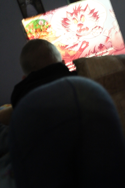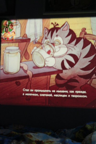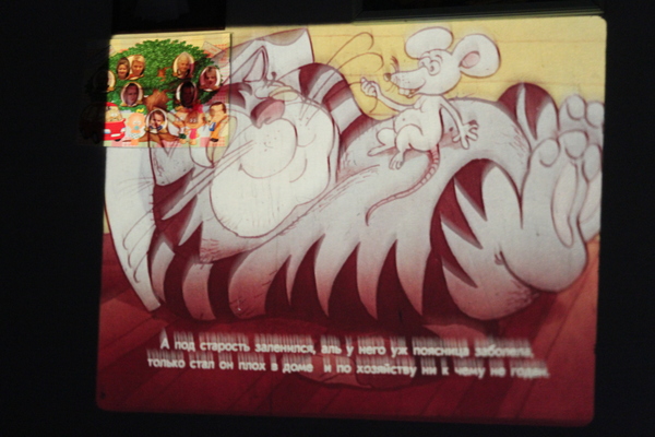 Прокручивали кадры и читали сказку. Но уже на 3 ей минуте Димка перестал слушать, и стал крутиться- вертеться перед лучом света. Читать тяжело - буковки нечеткие, картинки "ядреные". Все таки наверное современные детки избалованны разносортными двд и цифровыми примочками )