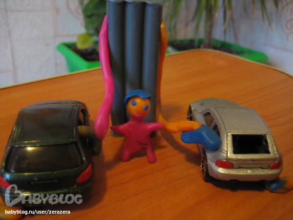 Тут Макар слепил короткий шланг бензоколонки. Повторили с ним понятие "короткий-длиный" и выявили причинно-следственную связь, а то есть к короткому шлангу ближе надо подъезжать, к длиному - подальше можно встать.