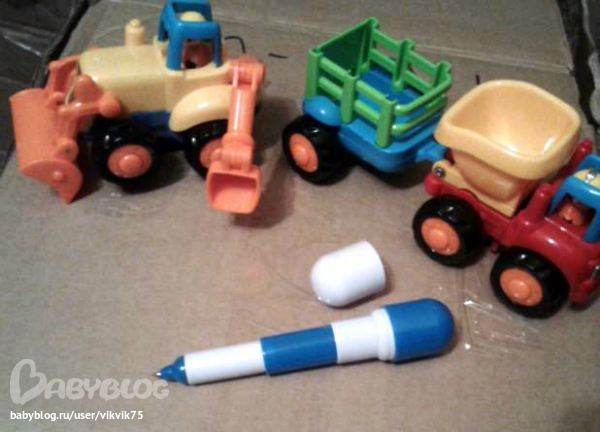 Набор машинок. Мы в киоске где-то купили просто экскаватор - практически любимая игрушка. Все гнется, ничего не отламывается, цвета яркие, ездит отлично. А тут наткнулась на целый набор таких машинок. Естественно сразу заказала. Тем более, что в Лабиринте такой набор почти в два раза дороже - около 600 р. А в Майшоп он мне обошелся в 350 р.