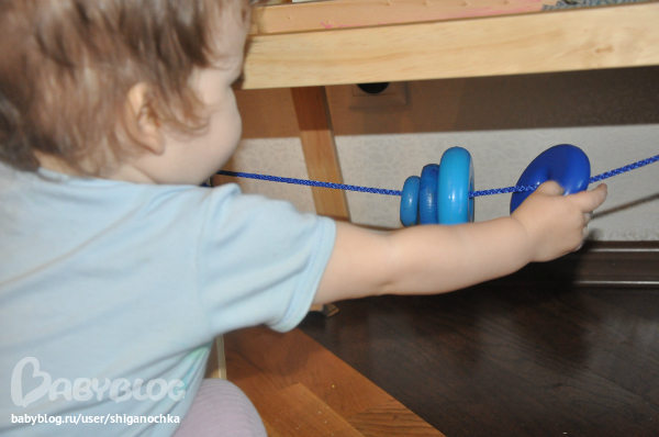 На дестких площадках Костя очень любит счеты. Спонтанно идея пришла в синий день - поэтому счеты синие, сейчас я их уже заменила и они разноцветые. Это кольца от пластмасовой пирамидки. Их там пять. И Костя уже их считает.