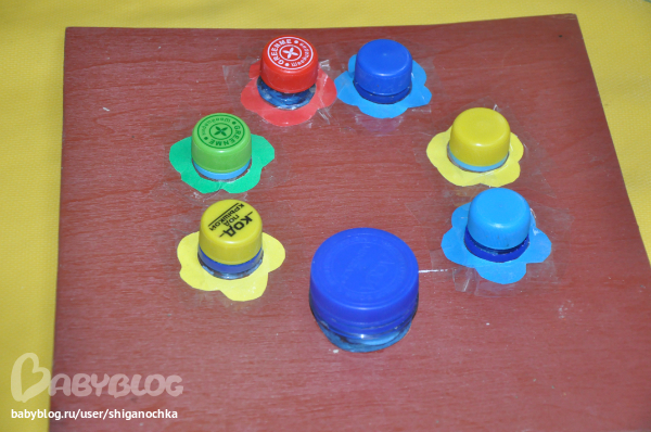 Наша открутышка преобразовалась в цветочки и теперь к ним нужно подбирать крышки нужного цвета. Самое сложное оказалось найти крышки нужного цвета! Даже на удице искала! Дома оказались одни голубые, пьем только минералку!