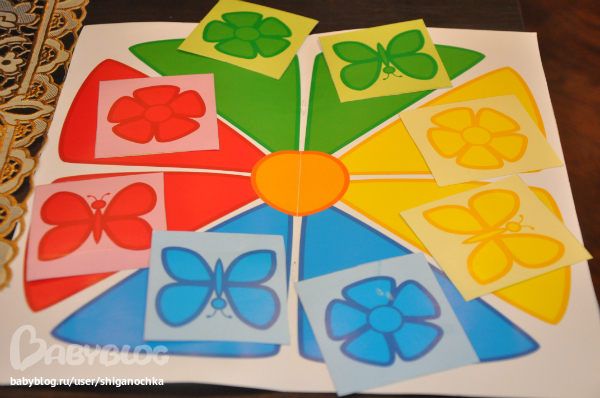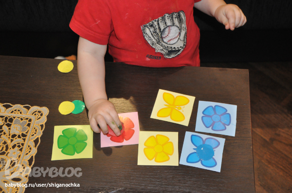 А когда вырезала цветочки, от них остались ровные кружочки цветные - и образовалась еще одна игра - положить кружочек нужного цвета на цветочек того же цвета. В конце недели это бло уже легко! А в начале не выполнимо)))