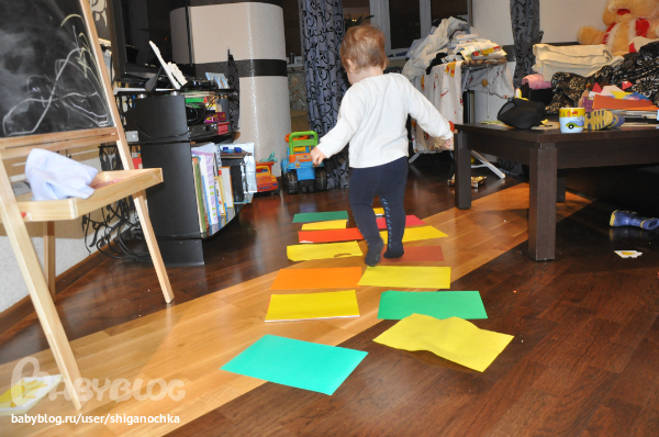 А еще сделали вот такую дорожку из разных листов цветой бумаги - надо было шагать только по желтым: