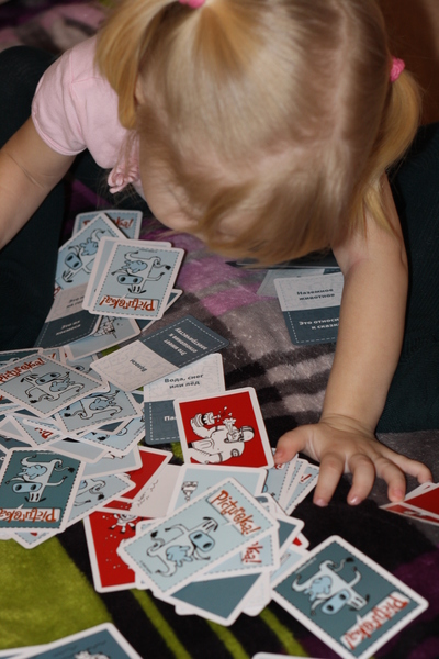 Играем мы так - поскольку все карты по инициативе дочки перемешиваются (а должны лежать картинкой вверх), то я беру карту-задание, озвучиваю. Задача Софьи найти картинку к моему вопросу. А если дочка не находит нужную карту, задумывается и отвечает на вопрос так, как считает нужным. Например, вопрос - на этом сидят. Карту мы не нашли и дочка выдает свои варианты - стул, диван, кровать...И так далее...