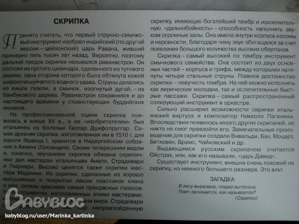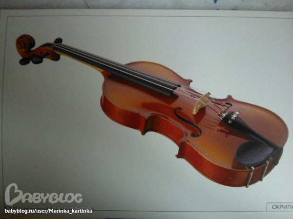 Честно говоря от карточек не в восторге, т.к. они на белом фоне и не понятно чем отличаются по размеру, например скрипка и виолончель. И рядом со скрипкой нет смычка( На да ладно, зато информацию можно предоставить ребенку.