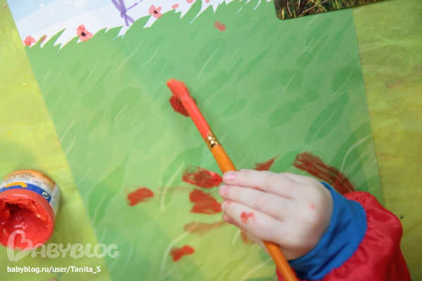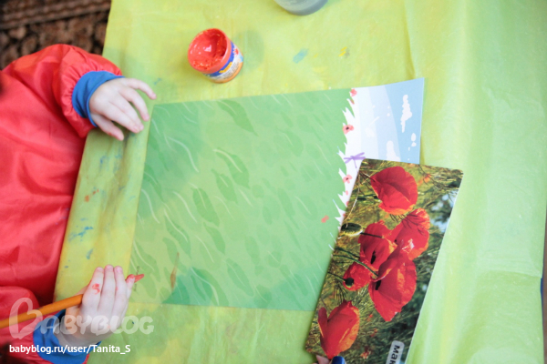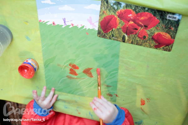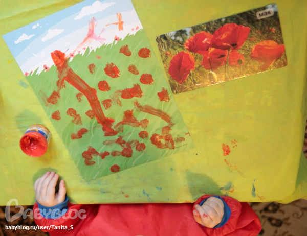 Совместили мы это рисование с Миром на ладошке Смотрели их перед тем, как начать рисовать. И я внимание на маках заострила... Вот мы и приготовились. Прототип перед нами, лист с полянкой тоже, кисточка в руках, краска и вода на месте. Поехали...