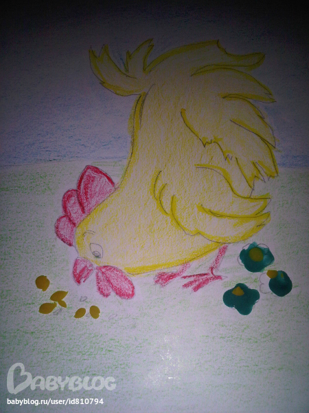 раскрашивали заготовку ватными палочками ( справа мой цыпленок,слева дочкин)