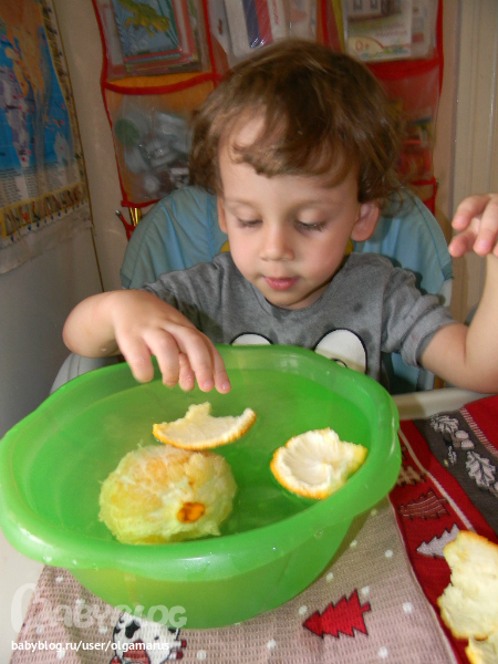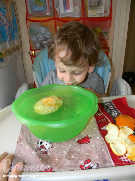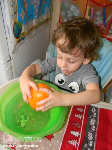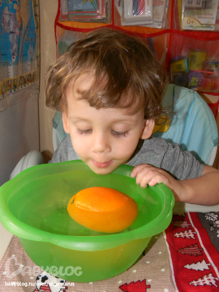 Спрсите ребенка, как думаешь если в воду апельсин положить он утонет или будет плавать, проверьте догадку, пускай малыш опустит апельсин в воду