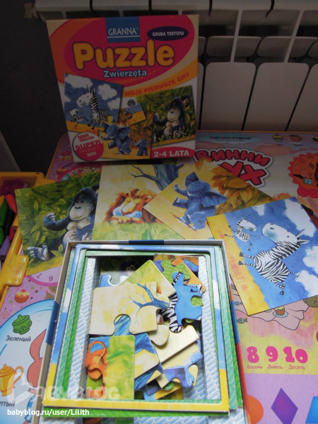 А сами пазлы - плотные, гладенькие, все края закруглены. Зверики - просто милашки. Ника очень любит их собирать, хотя переросла такое количество кусочков уже давно.