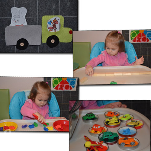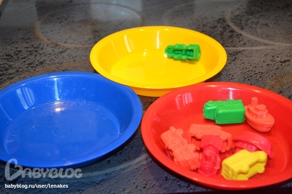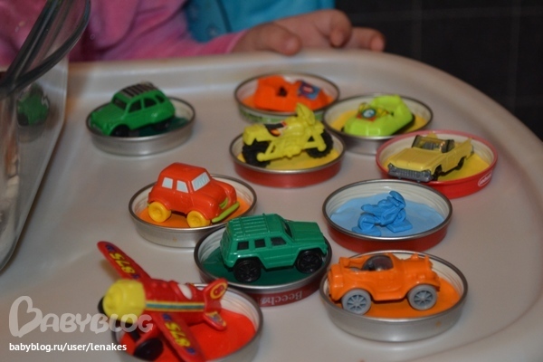 1. Первым заданием было отыскать в фасоле маленькие машинки и подобрать каждой свой гараж. Некоторые игрушки были ну очень мелкие и так было интересно их искать. Сортирует по цветам Настена уже даже не задумываясь.