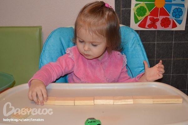 5. Выкладывали дорогу для машинки из конструктора. Настена старается положить все ровно, злится когда не получается.