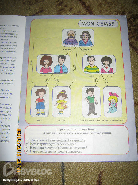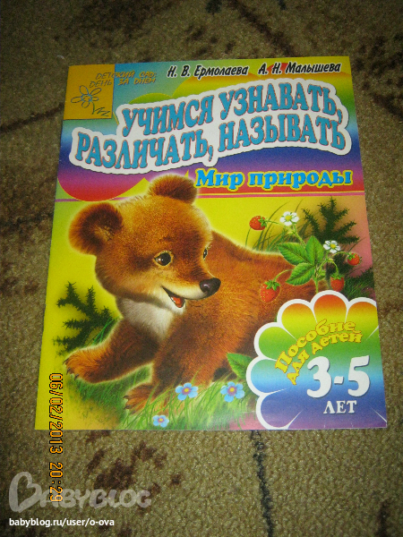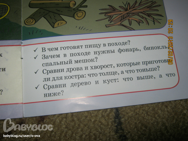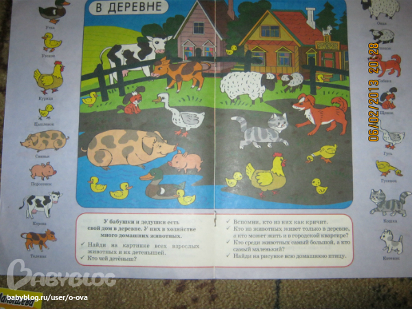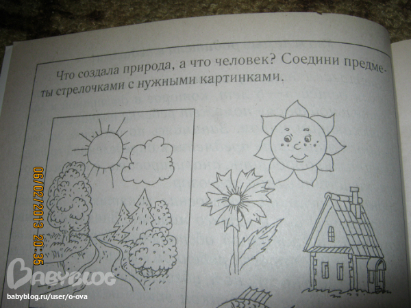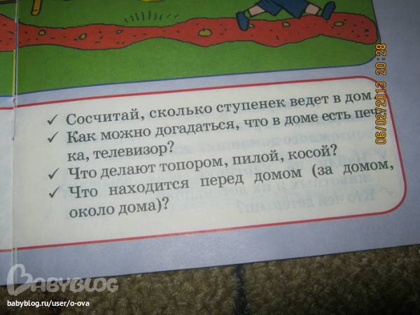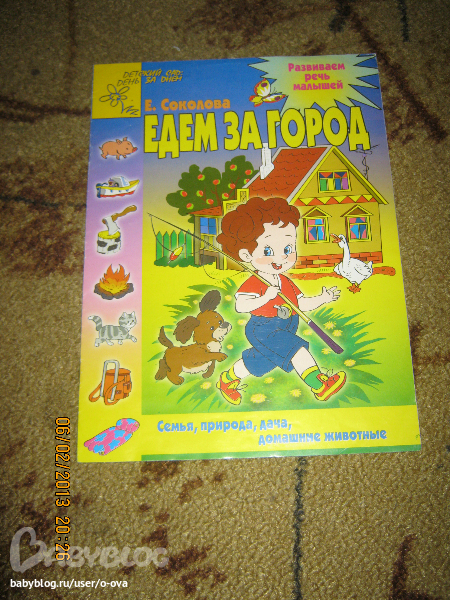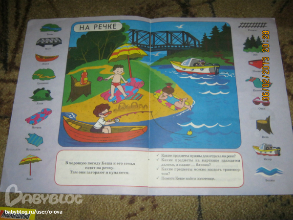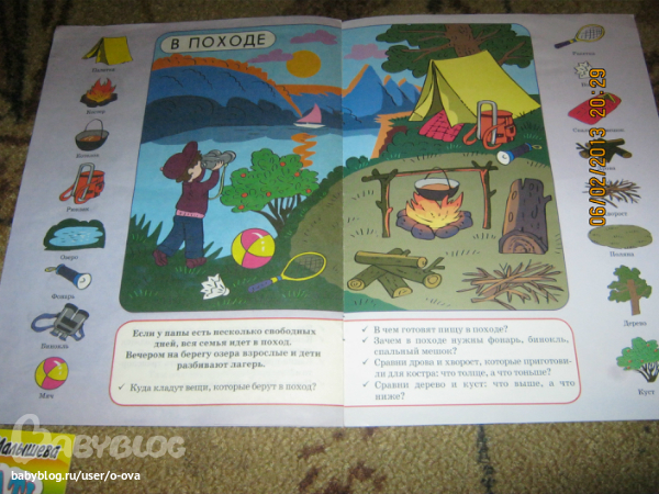 Смотрели ее лет с 2. Бумага у нее, конечно, тонкая. Газетная. Но лично я не привередлива и сын книжки у меня не рвал, поэтому особой проблемы в этом не увидела. Построена книга по приципу, Школы семи гномов, то есть дается одна большая картинка, а с боку даны изображения определенных предметов, которые нужно найти на картинке. Предметы небанальные, например, бинокль))) Внизу даны вопросы, которые стоит задать ребенку. Тематика очень различная: семья, дача, домашние животные, на реке, в походе и т.д.