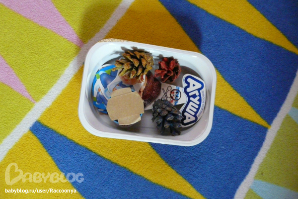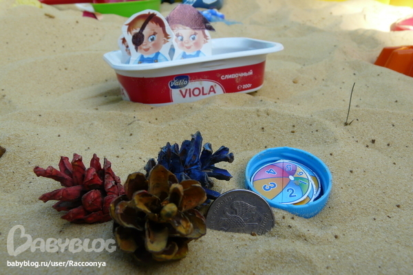 Ну, и, конечно, пираты не были бы пиратами, если бы не искали сокровища! Шишки, монетки, маленькие картонные картинки - были задуманы для тренировки маленьких пальчиков, бесконечно закапывающих и откапывающих их.