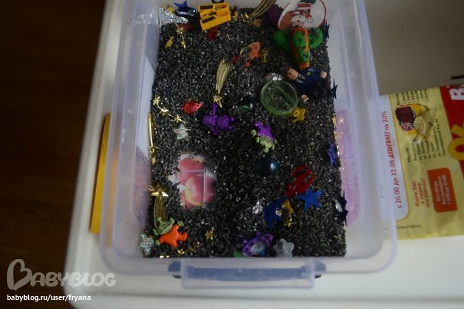 МиниСенсорные коробочки, наполнение: окрашенный гуашью рис, пайетки, бисер, разные бусины, марблс и всякие мелочи, которые Даша с удовольствием искала ))