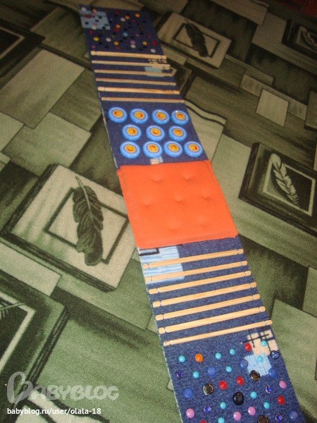 Ткань коврика-обрезок ковралина нашего, палочки муж нарыл в гараже (чудесным образом они у нас оказались, муж уверял, что не найдет ни каких реечек, а я его все-равно отправила искать), обтисал и насечки сделал, пуговки это "сокровища" свекрови)))), мягкую подушечку я сделала из паралона, а оранжевая ткань сверху - я порезала футболку мужа (только ему не говори