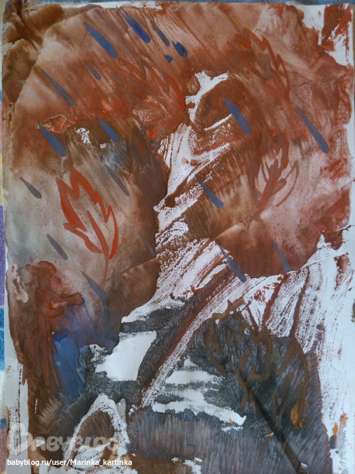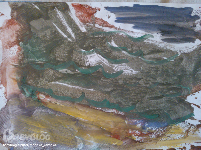 И снег в горах. Снег рисовала уже дочурка пальчиками и белой гуашью: