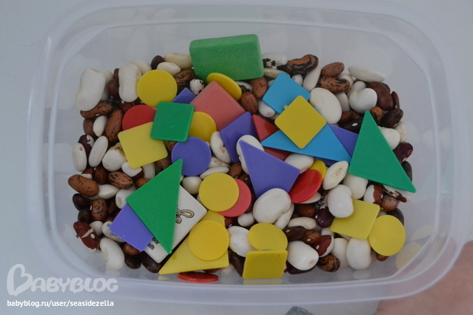 Наша сенсорная коробочка состояла из фасоли, пластмассовых фигур для счета и прямоугольных затирачек, из которых Матвей потом почему-то строил поезда. Сказать что фасоль была рассыпана по всему дому, это ничего не сказать)))) у нас это постоянная проблема, всё содержимое сенсорных коробочек, пересыпается, перекладывается и в конечно итоге отправляется на пол, я уже знаю что вот вот этом момент настанет, пытаюсь все аккуратно конфисковать, но в ответ получаю только возмущение, так что мелкую моторику развивает всей семьей, все всё собирают))))